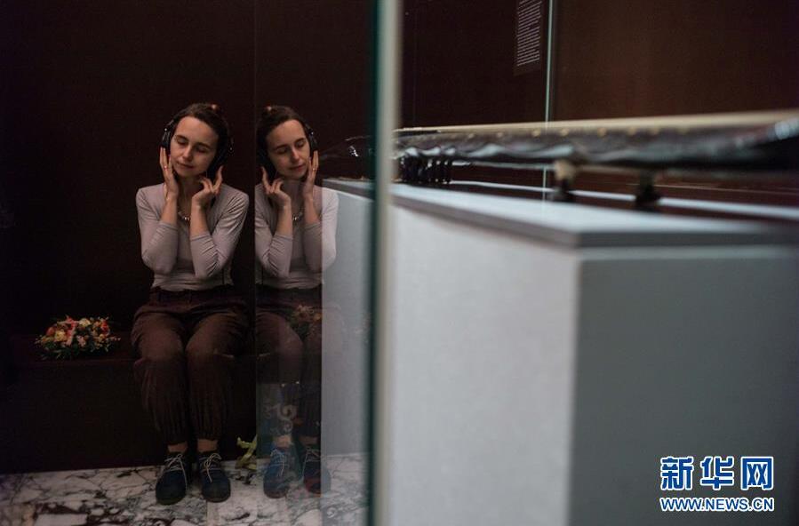 4月16日,在俄罗斯首都莫斯科的克里姆林宫博物馆,一名参观者用古琴旁的电子播放器欣赏古琴乐曲。新华社记者 吴壮 摄