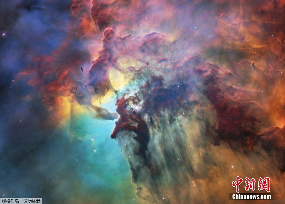 这张图片只显示了礁湖星云的一小部分,据4光年的宽度范围。这个巨型星云最早是在1654年被意大利天文学家乔瓦尼·巴蒂斯特· 霍迪尔纳发现并纪录,从那以后,礁湖星云便吸引了全世界的天文学家的目光。