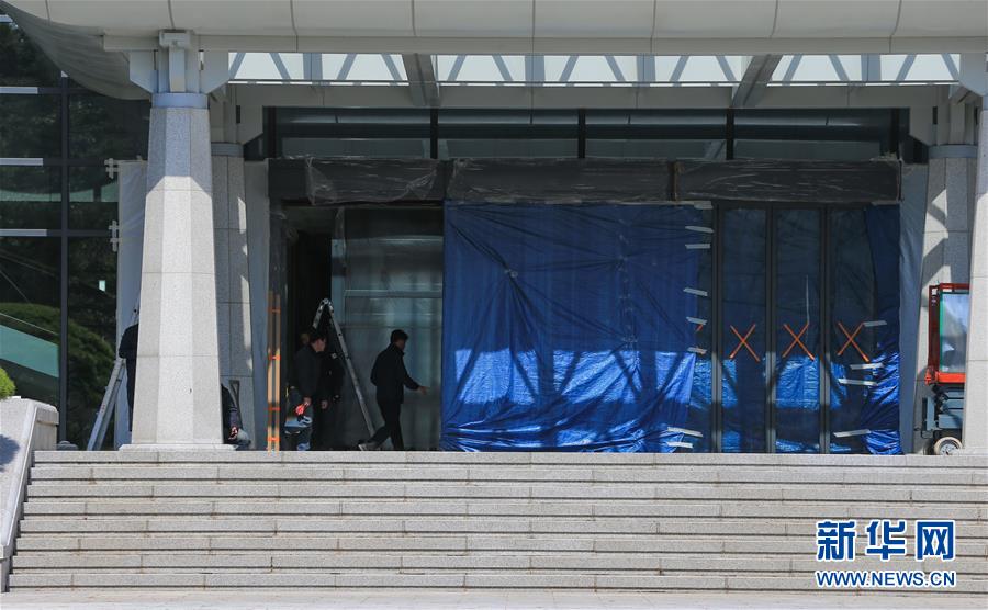 这是4月18日拍摄的板门店韩方一侧“和平之家”的正门,目前正在进行修缮。