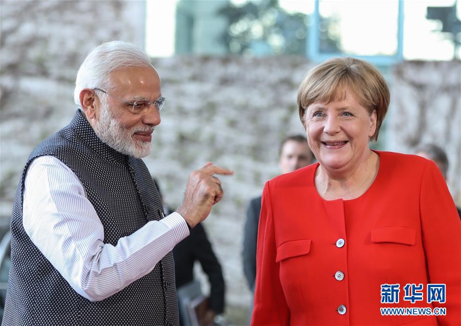 4月20日,在德国柏林,德国总理默克尔(右)与到访的印度总理莫迪交谈。当日,德国总理默克尔在柏林会见到访的印度总理莫迪。新华社记者 单宇琦 摄