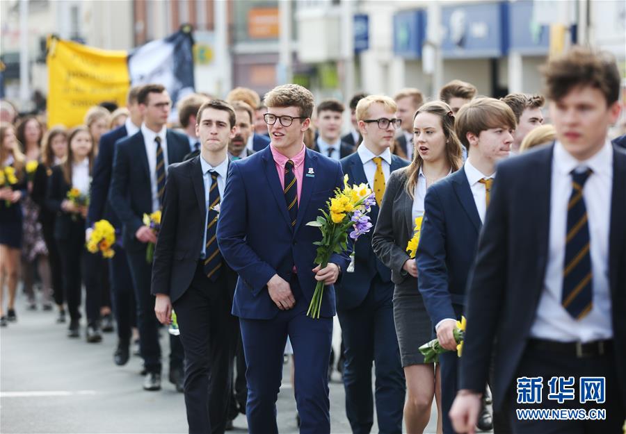 4月21日,在英国埃文河畔斯特拉特福小镇,学生们参加游行活动。当日,人们在莎士比亚出生地英格兰中部城市埃文河畔斯特拉特福小镇举行活动,纪念这位文学巨匠诞辰454周年。新华社发(伊莎贝尔·因方特摄)