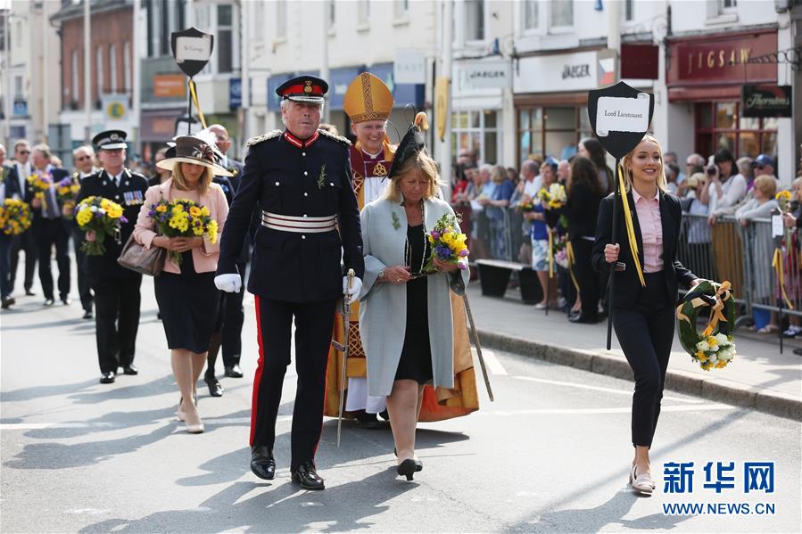 4月21日,在英国埃文河畔斯特拉特福小镇,人们参加游行活动。当日,人们在莎士比亚出生地英格兰中部城市埃文河畔斯特拉特福小镇举行活动,纪念这位文学巨匠诞辰454周年。新华社发(伊莎贝尔·因方特摄)