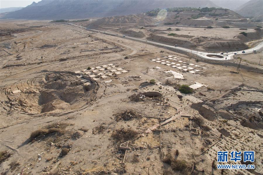 这是4月9日,在以色列艾因盖迪附近拍摄的因死海沿岸塌陷改道的90号公路和废弃的居民点。新华社记者郭昱摄