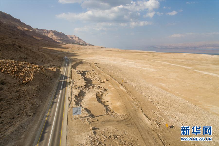 4月9日,在以色列艾因盖迪附近,车辆行驶在90号公路上,路标显示“小心前方塌陷区”。新华社记者郭昱摄