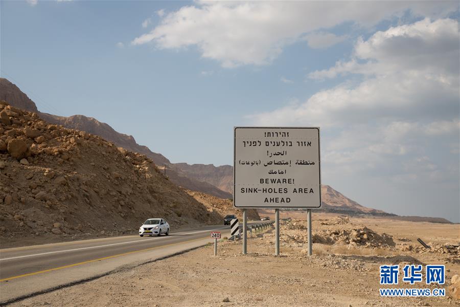 4月9日,在以色列艾因盖迪附近,车辆行驶在90号公路上,路标显示“小心前方塌陷区”。新华社记者郭昱摄