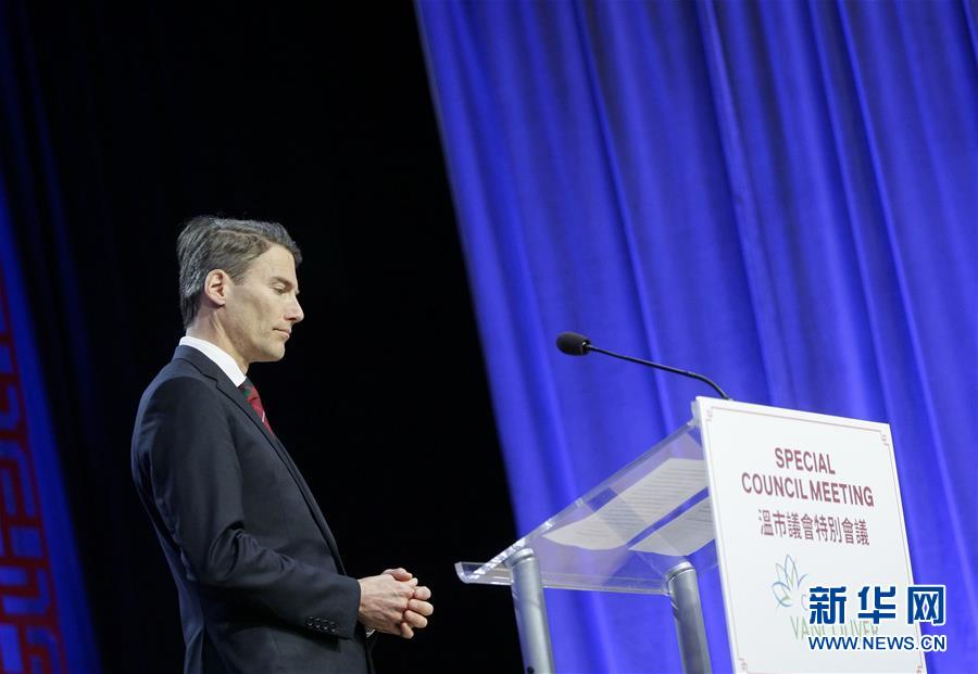 4月22日,在加拿大温哥华唐人街的华人文化中心,温哥华市长罗伯逊宣读正式道歉声明。新华社发(梁森摄)