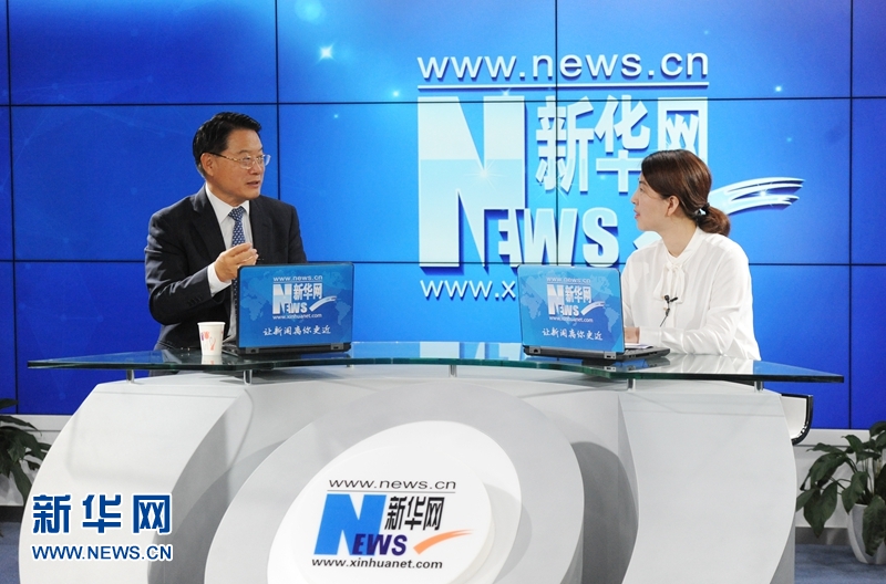 4月24日,联合国工业发展组织总干事李勇(左)在北京接受了新华网独家专访。图为李勇在接受本次访谈主持人、新华网海外传播中心国际部主任徐倩专访。新华网记者 陈竞超摄