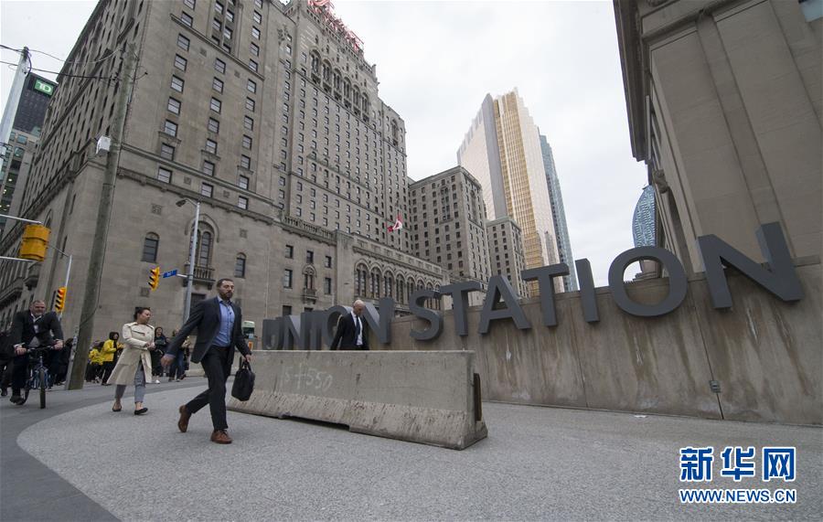 4月24日,在加拿大多伦多联合车站,行人从新设置的水泥墩旁经过。加拿大多伦多24日在市区人流量密集的联合车站外设置了防止车辆冲撞的水泥墩,以确保行人安全。此前一天,多伦多发生汽车冲撞行人事件,造成10人死亡、15人受伤。新华社发 邹峥 摄