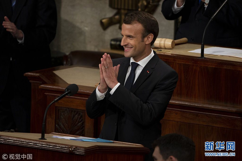 4月25日,美国华盛顿,法国总统马克龙在美国国会山发表演讲。(图片来源:视觉中国)