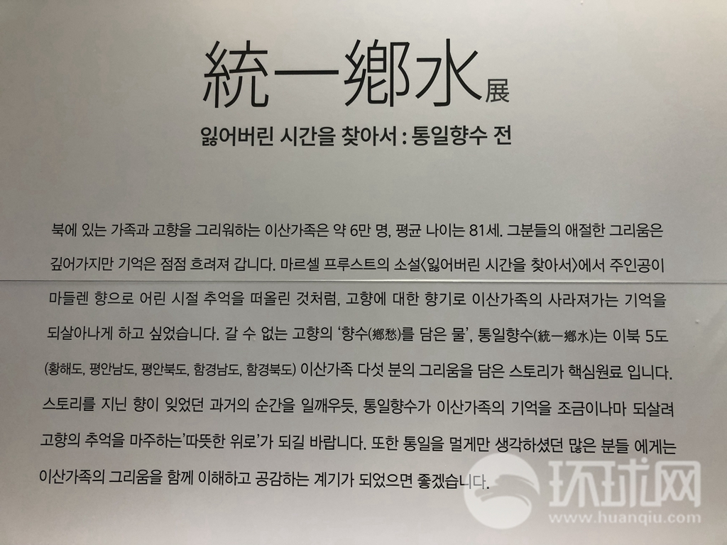 新闻中心的“统一乡水”展,找寻丢失的时间--统一乡水展。在朝鲜约有6万名思念家人和故乡的离散家属,他们的平均年龄为81岁,他们对故乡的思念之情虽然越来越浓厚,记忆却在慢慢流失。在玛德琳《找寻丢失的时间》这本小说中,主人公玛德琳想用故乡的香气唤回离散家属渐渐消失的记忆。“统一乡水展(到不了的故乡,饱含乡愁的水)”,是以朝鲜5个道的五个部分的离散家属思念的故事为核心,“统一乡水”希望通过这些故事为离散家属找回哪怕是一丁点关于故乡的记忆。