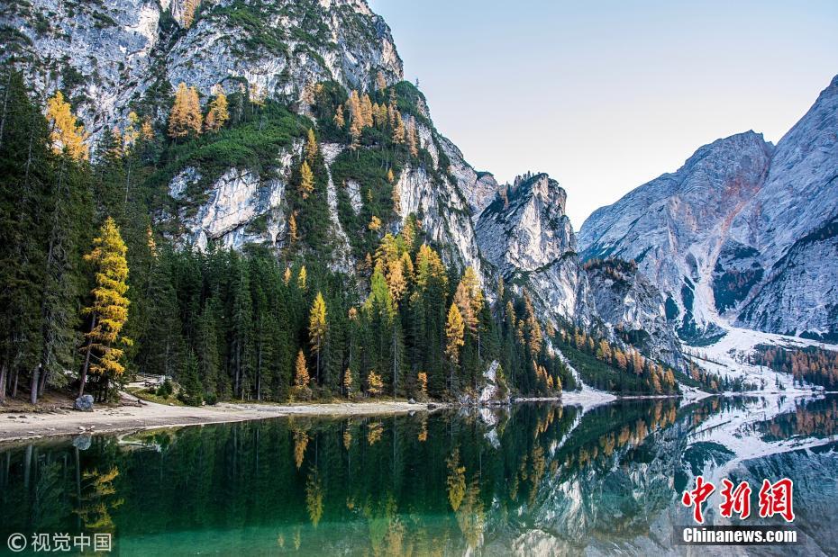 2018年4月26日讯(具体拍摄时间不详),意大利南蒂罗尔省阿尔卑斯山脉,蓝绿色的Braies湖像一面天然的镜子,倒映出地上美景。根据传说,这个湖是挖矿产生的,矿工开采出一个泉眼,将他们的宝贝掩盖在湖底。湖水有30多米深,占地31公顷,是多洛米蒂山区最大的湖泊之一。图片来源:视觉中国