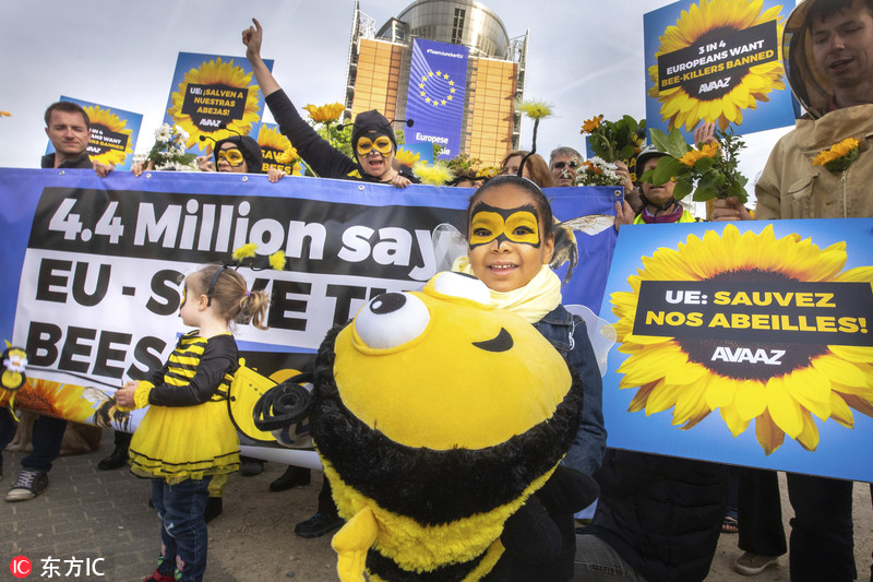 当地时间2018年4月27日,比利时布鲁塞尔,民众扮成蜜蜂在欧盟总部前的舒曼广场上集会,呼吁通过新烟碱农药禁令。当天,欧盟将就禁用三类危害蜜蜂的农药进行投票表决。据悉,蜜蜂为80%的谷物和果树提供了授粉途径。