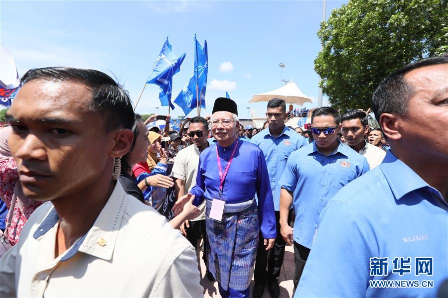 4月28日,在马来西亚彭亨州北干,现任马来西亚总理、执政联盟国民阵线领导人纳吉布(中)在完成登记后与支持者握手。马来西亚28日完成了全国范围内的国会下议院议员及地方议员候选人登记工作,标志着马来西亚正式进入为期11天的竞选期。新华社记者 朱炜 摄