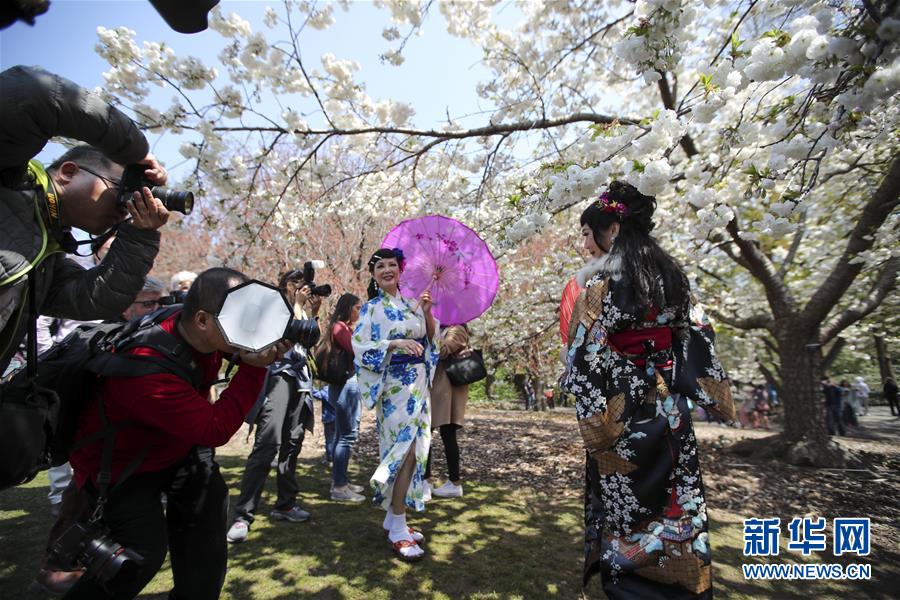 4月28日,在美国纽约布鲁克林植物园,人们在樱花树下拍照。当天,纽约布鲁克林植物园举行一年一度的樱花节活动,吸引众多游人前来赏花拍照,感受樱花之美。 新华社记者王迎摄