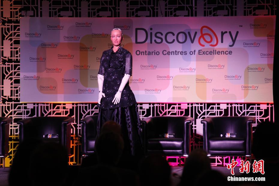 当地时间4月30日,人形机器人索菲亚在多伦多举行的“Discovery”创新成就展上亮相,受到关注。该展会是加拿大创新领域规模最大和最具影响力的年度活动。2017年10月,沙特阿拉伯授予索菲亚公民身份,使其成为史上首个获人类公民身份的机器人。中新社记者 余瑞冬 摄
