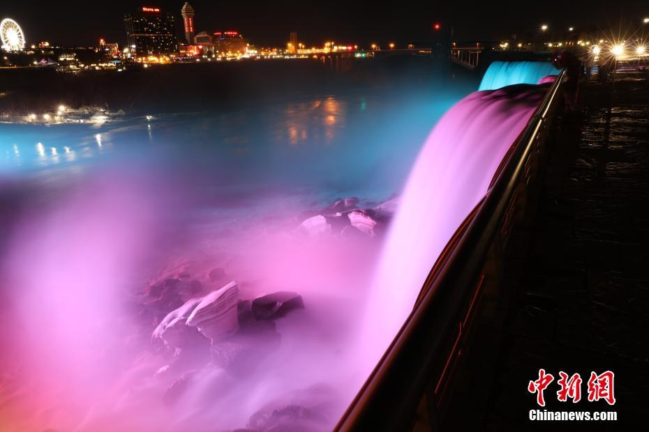 当地时间4月29日,美国纽约州与加拿大安大略省交界处的尼亚加拉瀑布气温回升、水量逐渐丰沛,美国一侧在该瀑布开行的雾中少女号游船随之复航,游客得以与大瀑布亲密接触。夜晚,瀑布在灯光照射下流光溢彩,吸引游客驻足。中新社记者 廖攀 摄