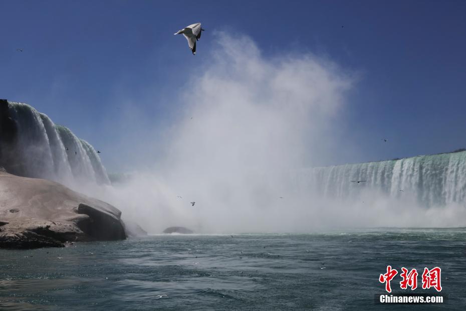 当地时间4月30日,美国纽约州与加拿大安大略省交界处的尼亚加拉瀑布气温回升、水量逐渐丰沛,美国一侧在该瀑布开行的雾中少女号游船随之复航,游客得以与大瀑布亲密接触。中新社记者 廖攀 摄