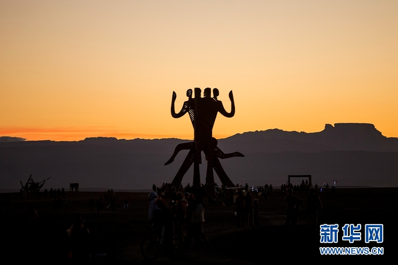 4月27日,在南非北开普省的卡鲁沙漠举行的“非洲火人节”上,随着夜幕降临,游客聚集在一件即将被焚烧的艺术品前。新华网发 威廉·穆维摄