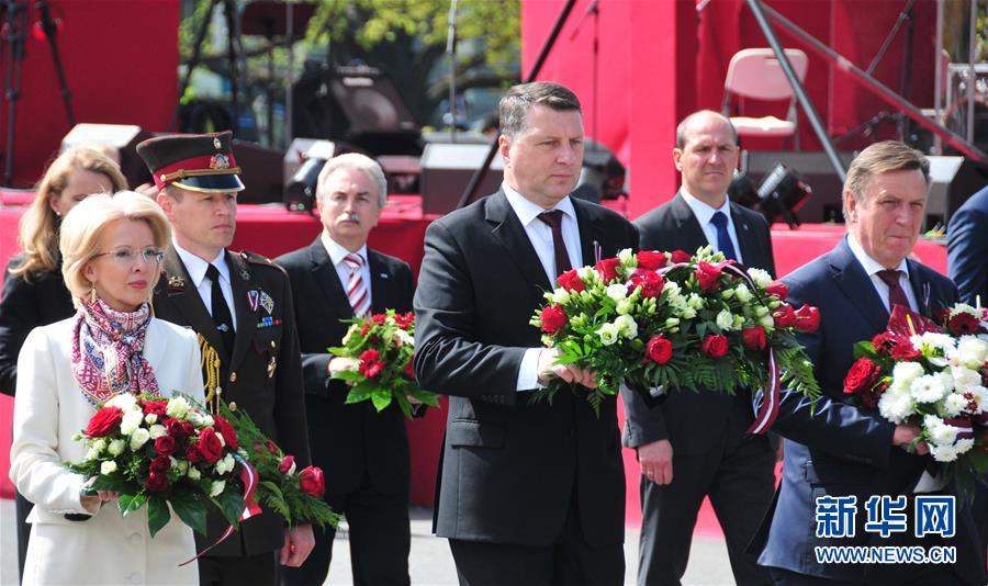 5月4日,在拉脱维亚首都里加,拉脱维亚总统韦约尼斯(中)、议长穆尔涅采(前左一)、总理库钦斯基斯(前右一)向祖国与自由纪念碑献花。当日,拉脱维亚全国各地举行各种活动,纪念国家恢复独立28周年。拉脱维亚曾是苏联加盟共和国之一。1990年5月4日,拉脱维亚最高苏维埃通过关于恢复拉独立的宣言,并改国名为拉脱维亚共和国。新华社发(亚尼斯 摄)