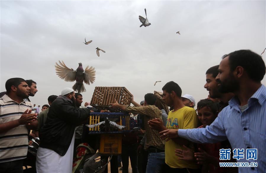 5月4日,在加沙地带边境地区,巴勒斯坦人放飞鸽子。