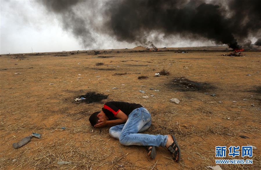 5月4日,在加沙地带边境地区,一名巴勒斯坦人因吸入催泪瓦斯倒地。