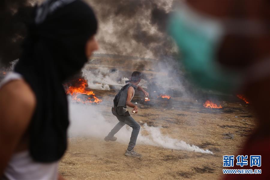 5月4日,在加沙地带边境地区,巴勒斯坦人向以色列方向投掷石块。