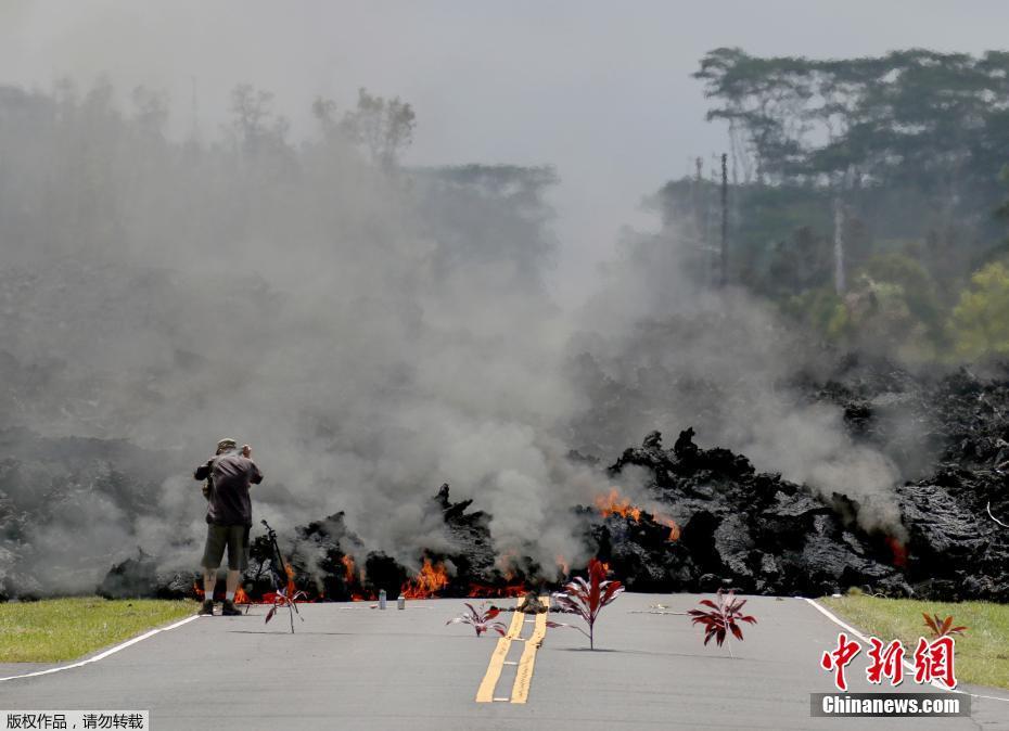 据悉,当地时间5日晚间,火山喷出熔岩的缺口已增加到9个,岩浆最高喷射至230英尺的高空,目前至少有9栋建筑被岩浆烧毁。图为夏威夷民众淡定的靠近熔岩,拿起拍摄设备进行拍照。