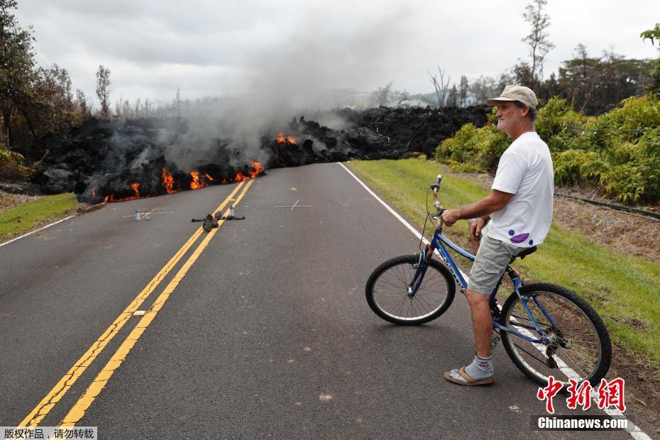 图为一名夏威夷居民骑车行进,前方的道路被熔岩阻断。报道称,火山爆发后,岩浆在火山下流动,大岛4日下午又发生规模6.9级的地震,也是大岛43年来最大的一次地震。