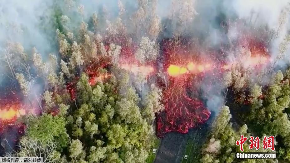 图为当地时间5月3日,航拍熔岩穿行道路时的骇人画面。熔岩在树木繁茂的地区蜿蜒而行,所到之处都成了焦土。