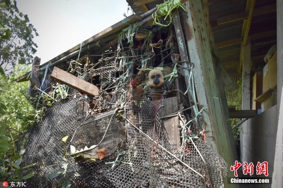 据泰国野生动物基金会称,这只长臂猿的主人联系到他们,希望能够让Thong过上更好的生活,工作人员随后赶到长臂猿的主人家中,将Thong从满是垃圾的笼中解救出来。据Thong的主人介绍,这只长臂猿是十年前从曼谷的Chatuchak周末市场上买来的,以为它可以作为宠物来喂养,但很显然他低估了长臂猿的野生属性,在随后的十年里,Thong出逃过数次,也曾伤过人。如今它不得不委身在这个狭小的笼子里,跟垃圾一起生活。 图片来源:东方IC 版权作品 请勿转载