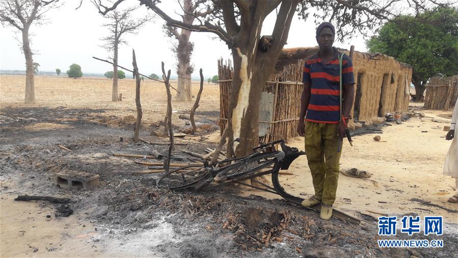 5月8日,在尼日利亚卡杜纳州比尔宁瓜里地区遭袭村庄,一名男子站在被烧毁的自行车旁。 新华社发(奥拉吞吉·萨柳摄)
