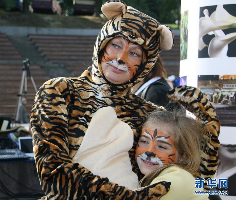 2011年9月24日,在乌克兰首都基辅,一对母女扮成老虎造型参与环保活动,呼吁保护地球和爱护动物。新华社发(奥尔加·塔尔诺夫斯卡娅 摄)