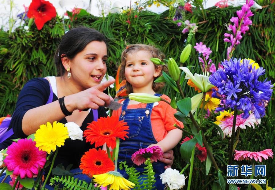 2013年5月11日,在葡萄牙马德拉岛,一对母女参加鲜花节。 新华社记者 张立云 摄