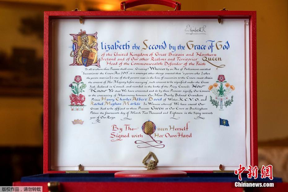 当地时间2018年5月11日,英国伦敦,白金汉宫公布了女王批准哈里王子和马克尔结婚的文件。