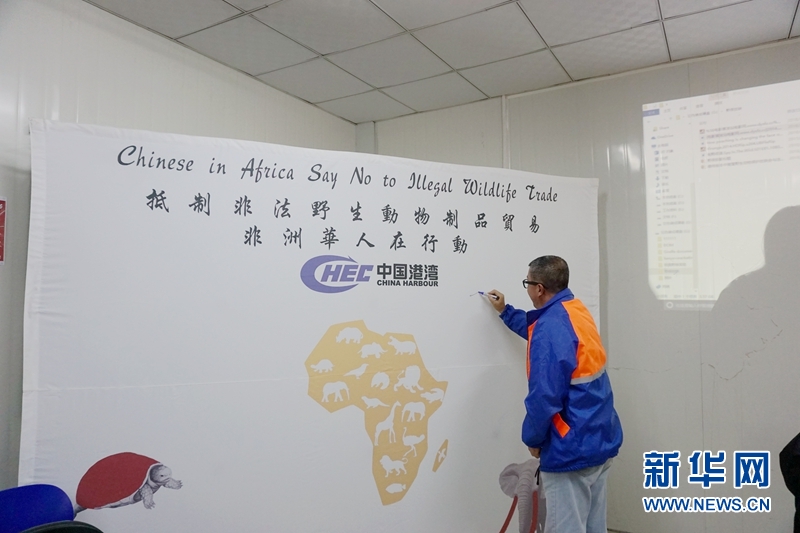中港湾纳米比亚项目部领导带头签名,承诺拒绝购买非法野生动物制品。新华网发 黄烨摄