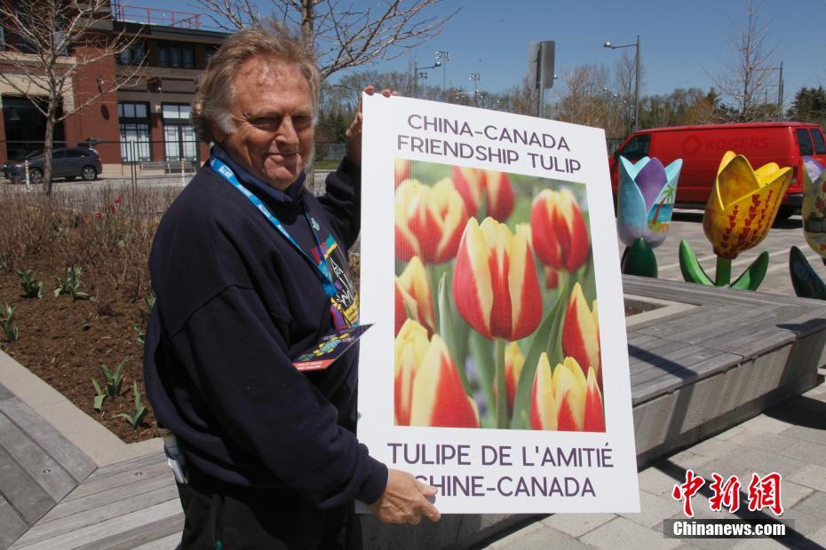 当地时间5月13日,在渥太华举行的2018年加拿大郁金香节迎来“中国日”特别活动。图为5月11日,加拿大郁金香节主席米歇尔·戈捷(Michel Gauthier)向记者展示一款被命名为“中加友谊”的红瓣黄边郁金香的照片。中新社记者 余瑞冬 摄