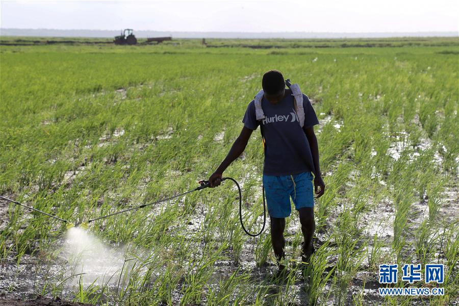 在南部非洲,有着“鳄河”之称的林波波河在莫桑比克加扎省首府赛赛汇入印度洋,浩荡的碧波经年累月冲刷着非洲大地,在这里形成千里沃野。这里的居民常挂在嘴边一个中文词,就是“万宝”。万宝莫桑农业园项目是目前中国在非洲最大规模水稻项目,也是中莫两国合作重点项目之一。项目集水稻种植、仓储、加工、销售于一体,规划开发2万公顷可耕种土地,通过培训当地农户,带动周边8万公顷水稻种植,以期形成10万公顷的种植规模。 3月3日,在莫桑比克加扎省的万宝莫桑农业园,当地农民喷洒农药。 新华社发