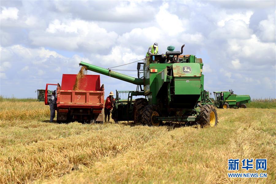 在南部非洲,有着“鳄河”之称的林波波河在莫桑比克加扎省首府赛赛汇入印度洋,浩荡的碧波经年累月冲刷着非洲大地,在这里形成千里沃野。这里的居民常挂在嘴边一个中文词,就是“万宝”。万宝莫桑农业园项目是目前中国在非洲最大规模水稻项目,也是中莫两国合作重点项目之一。项目集水稻种植、仓储、加工、销售于一体,规划开发2万公顷可耕种土地,通过培训当地农户,带动周边8万公顷水稻种植,以期形成10万公顷的种植规模。 4月4日,在莫桑比克加扎省的万宝莫桑农业园,收割机将稻谷传输至卡车。 新华社发