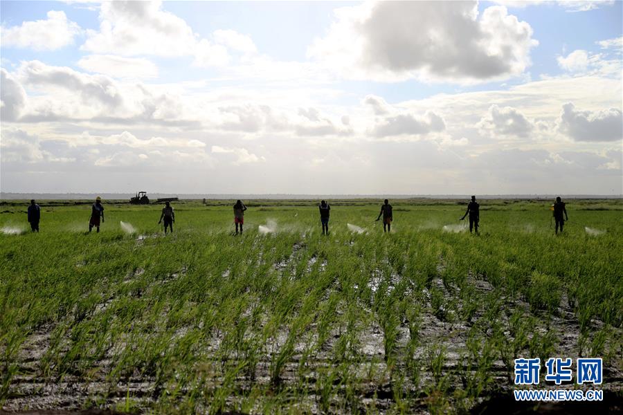 在南部非洲,有着“鳄河”之称的林波波河在莫桑比克加扎省首府赛赛汇入印度洋,浩荡的碧波经年累月冲刷着非洲大地,在这里形成千里沃野。这里的居民常挂在嘴边一个中文词,就是“万宝”。万宝莫桑农业园项目是目前中国在非洲最大规模水稻项目,也是中莫两国合作重点项目之一。项目集水稻种植、仓储、加工、销售于一体,规划开发2万公顷可耕种土地,通过培训当地农户,带动周边8万公顷水稻种植,以期形成10万公顷的种植规模。 3月3日,在莫桑比克加扎省的万宝莫桑农业园,当地农民喷洒农药。 新华社发