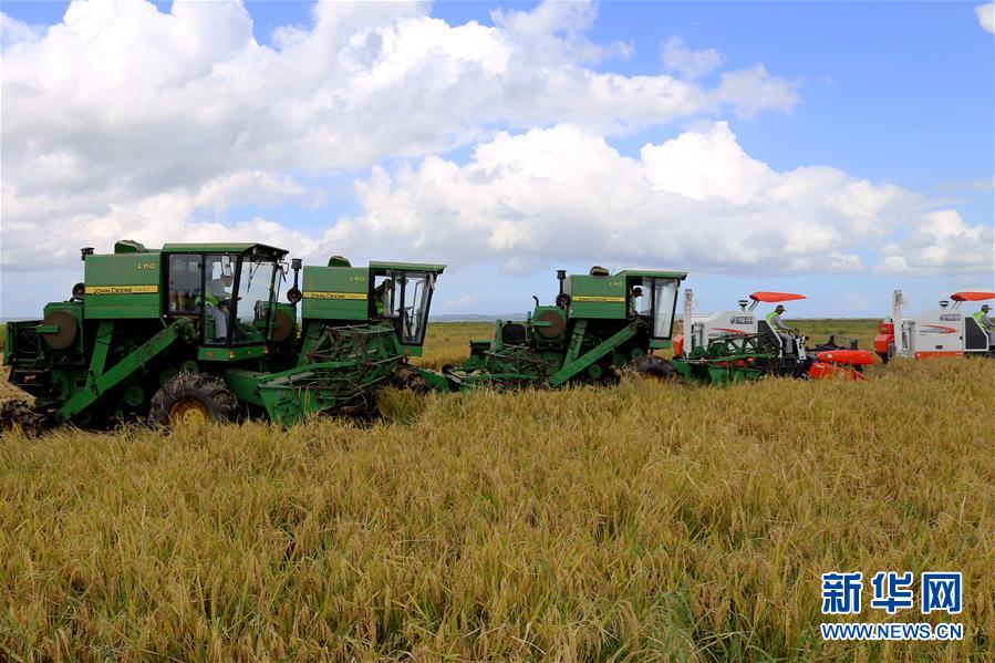 在南部非洲,有着“鳄河”之称的林波波河在莫桑比克加扎省首府赛赛汇入印度洋,浩荡的碧波经年累月冲刷着非洲大地,在这里形成千里沃野。这里的居民常挂在嘴边一个中文词,就是“万宝”。万宝莫桑农业园项目是目前中国在非洲最大规模水稻项目,也是中莫两国合作重点项目之一。项目集水稻种植、仓储、加工、销售于一体,规划开发2万公顷可耕种土地,通过培训当地农户,带动周边8万公顷水稻种植,以期形成10万公顷的种植规模。 4月4日,在莫桑比克加扎省的万宝莫桑农业园,收割机在稻田里收割。 新华社发