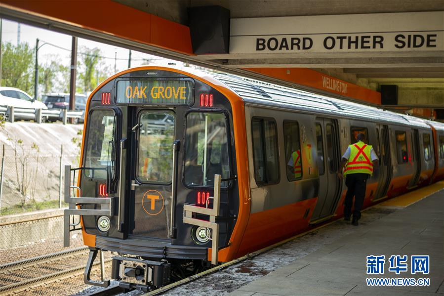 这是5月15日在美国马萨诸塞州梅德福德惠灵顿站拍摄的中车长客为波士顿橙线地铁“量身订制”的首批车辆。 15日,中车长春轨道客车股份有限公司(简称“中车长客”)为波士顿橙线地铁“量身订制”的首批4节车辆在惠灵顿站进行线上试车,车辆有望在今年年底通过测试正式投入使用。新华社记者 李木子 摄