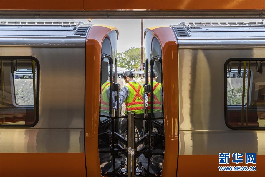 这是5月15日在美国马萨诸塞州梅德福德惠灵顿站拍摄的中车长客为波士顿橙线地铁“量身订制”的首批车辆。 15日,中车长春轨道客车股份有限公司(简称“中车长客”)为波士顿橙线地铁“量身订制”的首批4节车辆在惠灵顿站进行线上试车,车辆有望在今年年底通过测试正式投入使用。新华社记者 李木子 摄