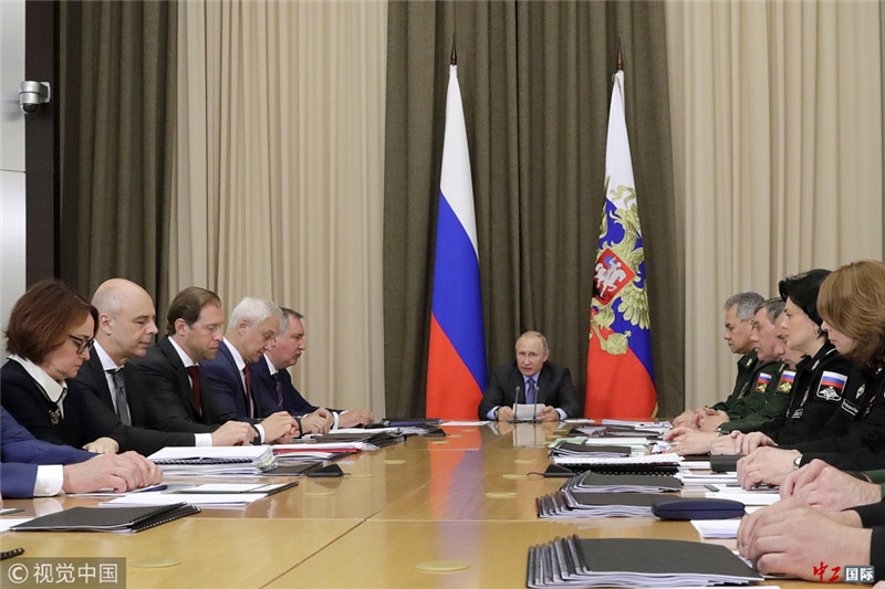 当地时间2018年5月16日,俄罗斯索契,俄罗斯总统普京召开军事会议。据俄罗斯卫星网5月16日报道,普京在军事会议中表示,搭载“口径”巡航导弹系统的俄罗斯军舰将在地中海“永久”待命,以应对叙利亚境内的恐怖主义威胁。