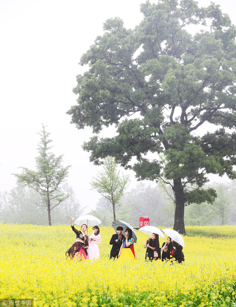当地时间2018年5月18日,韩国京畿道,广州市昆池岩邑的陶瓷公园,一群高中女生在一片黄灿灿的油菜花田中拍毕业照,记录花样年华。