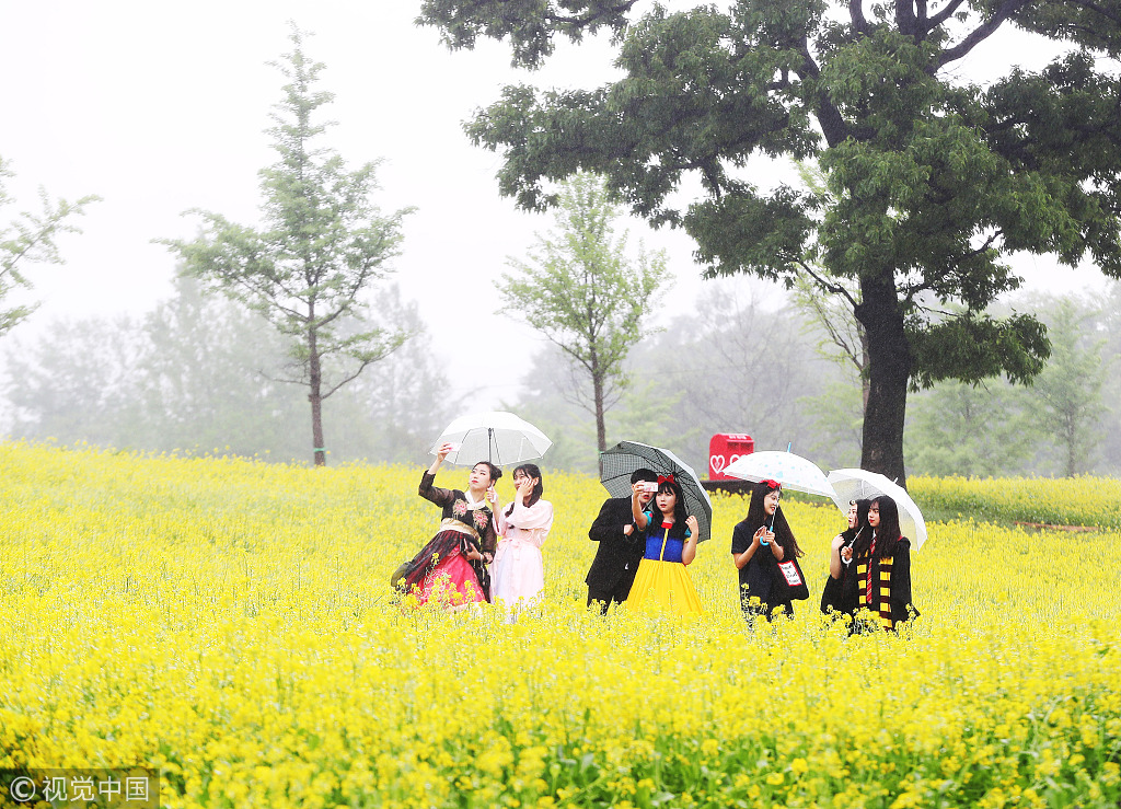 当地时间2018年5月18日,韩国京畿道,广州市昆池岩邑的陶瓷公园,一群高中女生在一片黄灿灿的油菜花田中拍毕业照,记录花样年华。