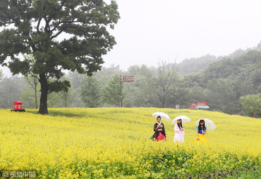 当地时间2018年5月18日,韩国京畿道,广州市昆池岩邑的陶瓷公园,一群高中女生在一片黄灿灿的油菜花田中拍毕业照,记录花样年华。