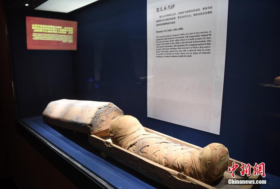 展览精心遴选来自意大利佛罗伦萨国立考古博物馆藏的100件(套)古埃及珍贵文物,分为魂兮归来一一永生的信仰、肉身不朽——木乃伊的制作、往生之所——棺柩的功能、事死如生——丧葬明器、享乐来生——生活用品五个部分,围绕埃及木乃伊和古埃及生命信仰文化,展示了永生信仰的产生、木乃伊制作过程、棺柩的作用、特殊随葬品和生活用品等,展品包括木乃伊、人形棺、圣甲虫、亡灵书、神像、首饰、化妆瓶、家具、植物纤维用具、凉鞋等,全面揭露了古埃及永生的宗教信仰体系的神秘面纱。图为在安徽省博物馆古埃及木乃伊特展上展出的“婴儿木乃伊”,该木乃伊保持当时特有的包装,整体用亚麻带交叉形成装饰图案。韩苏原 摄