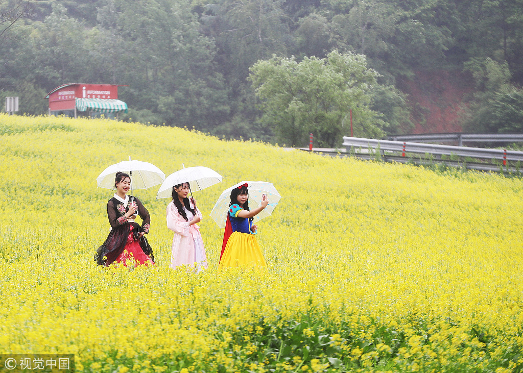 韩国女高中生在油菜花田拍摄毕业照 徜徉金色花海与花比美