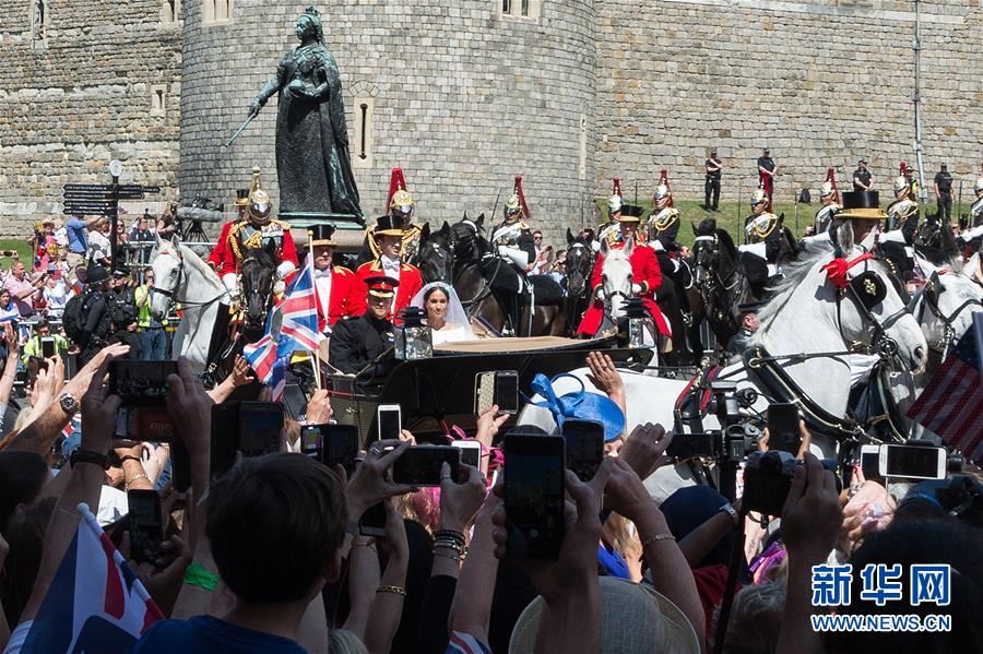 5月19日,在英国温莎的温莎城堡,英国哈里王子与妻子梅根·马克尔在婚礼仪式结束后乘坐马车进行巡游。新华社发 雷伊·唐摄