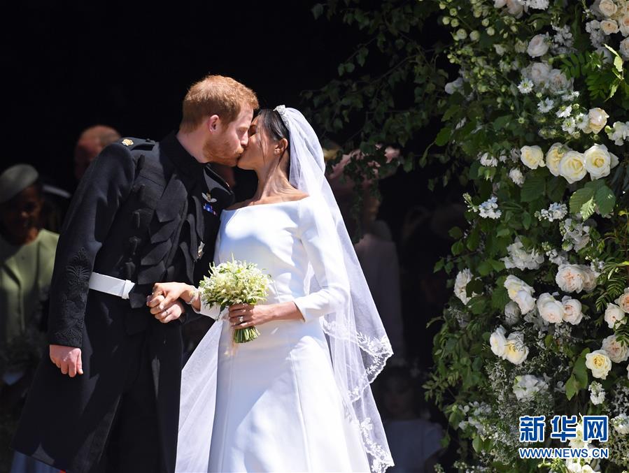 5月19日,在英国温莎的温莎城堡,英国哈里王子(左)与妻子梅根·马克尔在婚礼仪式结束后亲吻。新华社发(欧新社供图)